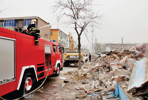 3月3日,忻府區(qū)城南片區(qū)拆遷工作全面展開,為避免城建拆除工作給周邊居民帶來的污染,忻府區(qū)領(lǐng)導(dǎo)迅速行動,安排部署區(qū)公安消防大隊(duì)消防車在拆遷現(xiàn)場及時進(jìn)行降塵灑水作業(yè)。圖為降塵灑水現(xiàn)場。(侯睿 攝)