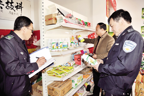 連日來(lái),代縣農(nóng)業(yè)綜合執(zhí)法大隊(duì)開(kāi)展農(nóng)資打假專項(xiàng)整治行動(dòng),對(duì)全縣4個(gè)農(nóng)資市場(chǎng)和30個(gè)農(nóng)資經(jīng)營(yíng)門店進(jìn)行了地毯式突擊檢查,圖為對(duì)農(nóng)資農(nóng)藥門店進(jìn)行檢查。(石俊文 攝)