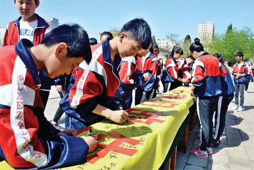 近日,第五屆“定襄讀書月”活動啟動儀式上,定襄第二中學(xué)的學(xué)生們紛紛在“讀書,讓生活更美好”的條幅上簽名,倡議多讀書讀好書。(劉小苗 攝)