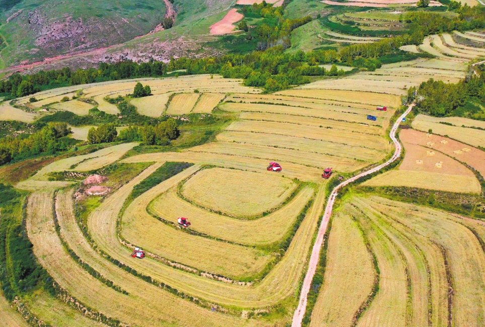寧武縣頭馬營(yíng)村萬(wàn)畝莜麥種植基地機(jī)械化收割場(chǎng)景。吳光宇攝