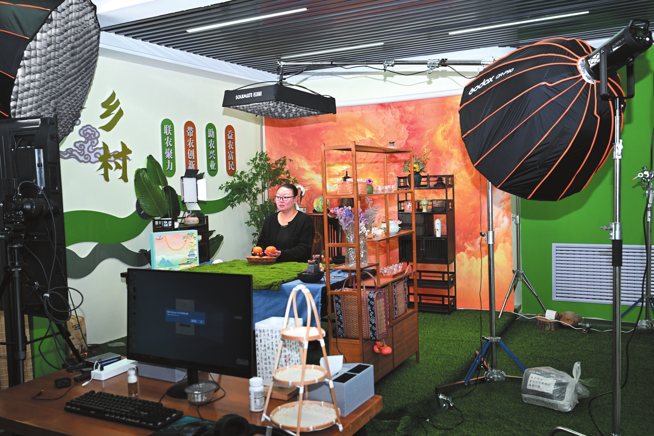五臺(tái)縣臺(tái)城鎮(zhèn)充分發(fā)揮到村工作大學(xué)生的知識(shí)優(yōu)勢(shì),積極建起電商中心,已重點(diǎn)推出陽(yáng)白鄉(xiāng)蜂蜜、陳家莊花椒、臺(tái)城鎮(zhèn)六道木文創(chuàng)手串三類(lèi)12種產(chǎn)品,日均銷(xiāo)售6000元,單日成交額最高達(dá)3萬(wàn)元。圖為主播直播帶貨賣(mài)柿子。(金俊賢攝)