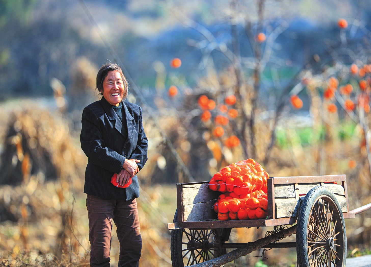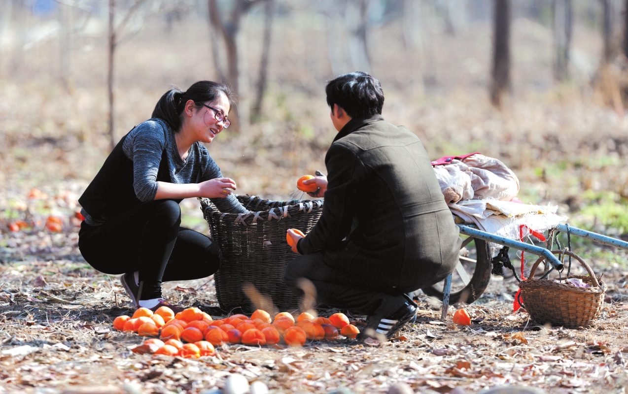 地頭那畔,景象便不同了。一對(duì)年輕的夫婦,正手腳利落地采摘、分揀柿子。竹籃里,橙紅的果實(shí)漸漸堆成小山。他們時(shí)而低語,聲音輕得像風(fēng)拂過枝梢,說的或許是今年柿子的成色,盤算著能賣個(gè)好價(jià)錢;或許是在憧憬,等這筆錢到手,該給娃添置些什么。他們額上有細(xì)密的汗珠,眉宇間有勞作后的倦色,但那份倦色底下,卻藏不住一股子蓬勃向上的勁兒,一種屬于明天的、清亮亮的盼頭。