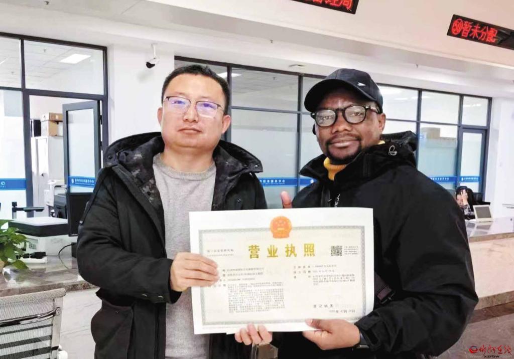 據(jù)了解,自獲悉Ininahazwe ilde-phonse來忻創(chuàng)業(yè)的意向后,市市場監(jiān)督管理局外資登記窗口便提供了全程幫辦服務(wù)。工作人員針對外國投資者可能遇到的語言、政策不熟悉等困難,主動進行“一對一”指導(dǎo),協(xié)助其完成從材料準(zhǔn)備到系統(tǒng)申報的全流程。圖為Ininahazwe ildephonse拿到營業(yè)執(zhí)照后,對工作人員的熱情服務(wù)豎起了大拇指。(本報通訊員攝)