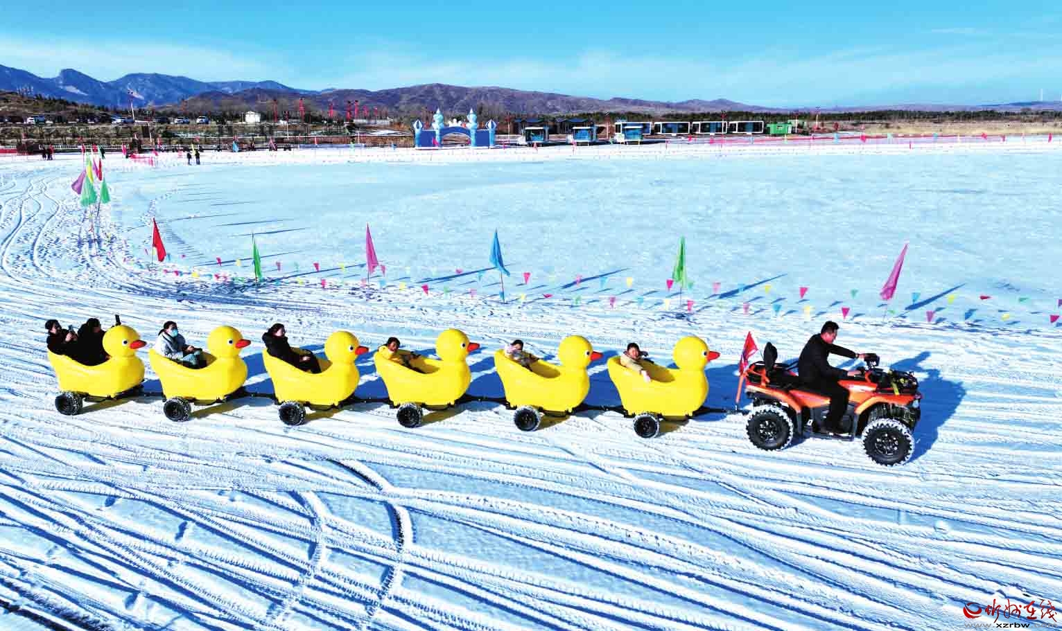 近日,寧武縣鴨子海冰雪大世界內(nèi)紅火熱鬧,一片歡樂景象。圖為冰面上,游客們盡情享受著冰雪項(xiàng)目帶來的樂趣。(吳光宇攝
