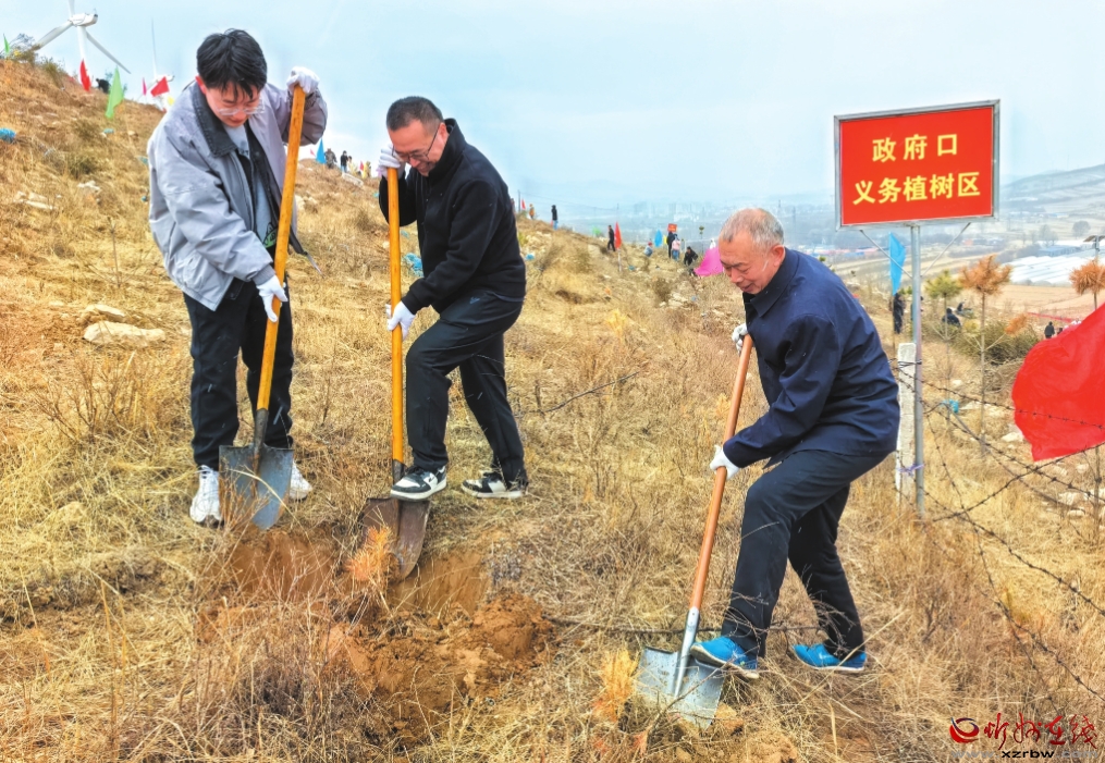 神池縣堅持?jǐn)U綠、興綠、護綠并舉,高標(biāo)準(zhǔn)推進國土綠化,筑牢晉北生態(tài)屏障。圖為該縣搶抓春季植樹造林黃金期,廣泛動員干部群眾在榮莊子村東山頭鄭志東攝上開展義務(wù)植樹活動。(鄭志東 攝)