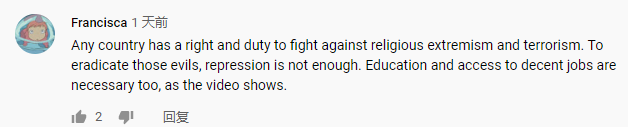“任何國(guó)家都有權(quán)利和義務(wù)打擊宗教極端主義和恐怖主義。要根除這些邪惡……教育和獲得體面工作的機(jī)會(huì)也是必要的。”近日,一名海外網(wǎng)友Francisca在看完中央廣播電視總臺(tái)旗下CGTN播出的《巍巍天山——中國(guó)新疆反恐記憶》紀(jì)錄片后這樣評(píng)價(jià)。