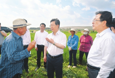 七月十三日,在右玉縣威遠鎮(zhèn)小香蔥種植基地,省委書記樓陽生向農戶了解產業(yè)帶動增收情況。山西日報記者李聯軍攝