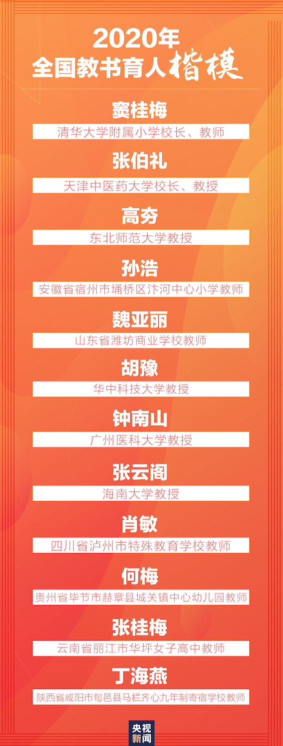 9月4日,2020年全國教書育人楷模名單發(fā)布,首次由中宣部和教育部聯(lián)合表彰,首次增加2個優(yōu)秀抗疫教師名額,共計推出12位“全國教書育人楷?!?。