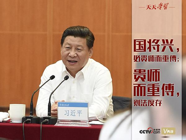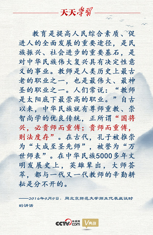 黨的十八大以來,以習(xí)近平同志為核心的黨中央高度重視教育工作,堅(jiān)持把優(yōu)先發(fā)展教育事業(yè)作為推動(dòng)黨和國家各項(xiàng)事業(yè)發(fā)展的重要先手棋。2014年9月9日,習(xí)近平總書記在同北京師范大學(xué)師生代表座談講話中,引用荀子的“國將興,必貴師而重傅;貴師而重傅,則法度存”,強(qiáng)調(diào)教育對(duì)國家繁榮、民族振興的重要意義。