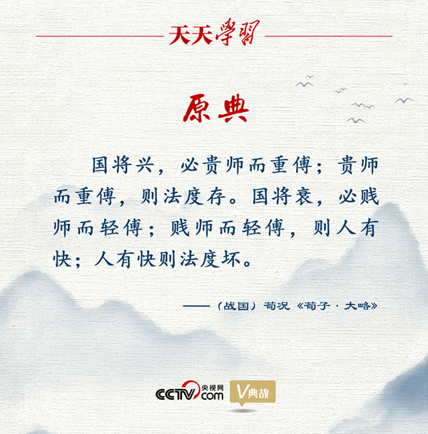 《荀子·大略》更是把教師地位提高到攸關(guān)國家興亡的高度:“國將興,必貴師而重傅;貴師而重傅,則法度存?!币馑际牵瑖覍⒁d盛,一定尊敬老師并看重有技能的人;如此,規(guī)矩和制度就能保持并得以推行。反之,國家將要衰微,一定鄙視老師并看輕有技能的人,如此人們就產(chǎn)生放肆之心;人有了放肆之心,規(guī)矩和制度就會(huì)被破壞。這一觀點(diǎn)在中國思想史上產(chǎn)生了十分深遠(yuǎn)的影響。
