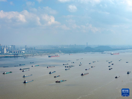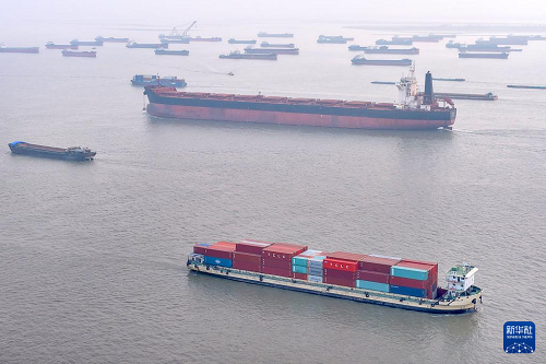 眾多貨船行駛在長(zhǎng)江江蘇南通段江面上(11月5日攝,無人機(jī)照片)。(新華社發(fā) 許叢軍 攝)