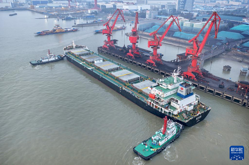 12月29日,南通港一處碼頭準(zhǔn)備卸運(yùn)電煤(無人機(jī)照片)。(新華社發(fā) 許叢軍 攝)