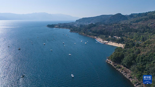 1月27日在云南省玉溪市拍攝的撫仙湖一景(無人機照片)。(新華社記者 高詠薇 攝)