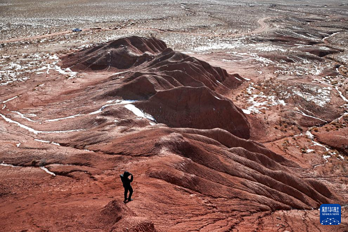 1月29日,游客在內蒙古烏蘭察布市四子王旗紅崖臺地拍照游玩。(新華社記者 貝赫 攝)