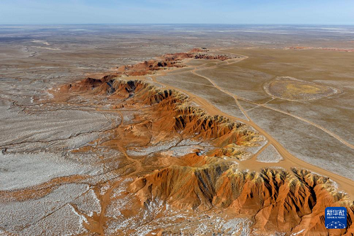這是1月29日在內蒙古烏蘭察布市四子王旗拍攝的紅崖臺地景觀(無人機照片)。(新華社記者 貝赫 攝)