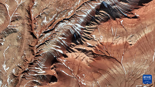 紅崖臺地位于內蒙古烏蘭察布市四子王旗北部,是內蒙古四子王國家地質公園的重要組成部分。這里山丘聳立、溝壑縱橫,山體呈現(xiàn)赤紅色。隆冬時節(jié),稀薄殘雪點綴其間,在蒼茫天地中勾勒出一幅靜謐而壯麗的自然畫卷。