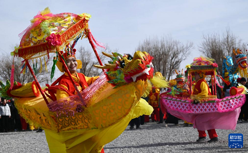 2月4日,一支社火隊(duì)在甘肅省敦煌市白馬塔景區(qū)表演劃旱船。(新華社發(fā) 張曉亮 攝)