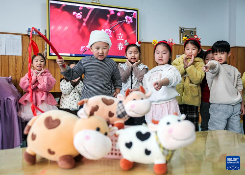 2月4日,在河南省焦作市博愛(ài)縣縣直幼兒園,小朋友做“打春?!庇螒颉#ㄐ氯A社發(fā) 程全 攝)