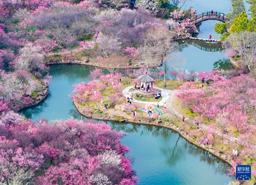 2月25日,游客在江蘇揚(yáng)州瘦西湖風(fēng)景區(qū)賞梅游玩(無人機(jī)照片)。(新華社發(fā) 周社根 攝)