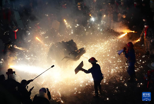 3月2日,在陜西旬陽(yáng)市蜀河鎮(zhèn)蜀河社區(qū),表演人員在用煙花“燒獅子”。(新華社記者 邵瑞 攝)