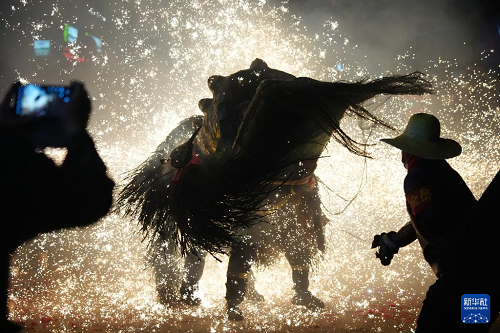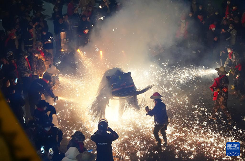 “蜀河燒獅子”于每年農(nóng)歷正月十三至十六舉行。夜幕降臨后,舞獅隊(duì)伍會(huì)走街串巷,在家家戶(hù)戶(hù)門(mén)前停留,通過(guò)舞獅來(lái)傳遞祝福。在此過(guò)程中,表演人員和圍觀(guān)群眾會(huì)點(diǎn)燃特制的煙花,朝“獅子”噴射火花。根據(jù)當(dāng)?shù)亓?xí)俗,“燒獅子”象征迎來(lái)好運(yùn)與吉祥,火花越猛,新年的運(yùn)勢(shì)越興旺。