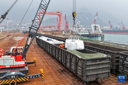 3月4日,工人在江蘇連云港港東方港務(wù)分公司碼頭鐵路裝車點(diǎn)將化肥裝上貨運(yùn)專列(無(wú)人機(jī)照片)。(新華社發(fā) 王健民 攝)