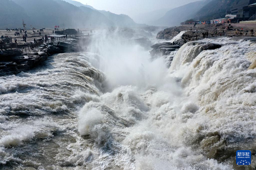 驚蟄時節(jié),隨著氣溫回暖,黃河上游河段融冰開河速度加快,壺口瀑布水量增大。