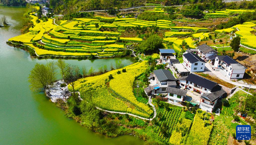 重慶市黔江區(qū)阿蓬江鎮(zhèn)大坪村油菜花開(kāi)放(3月4日攝,無(wú)人機(jī)照片)。(新華社發(fā) 楊敏 攝)
