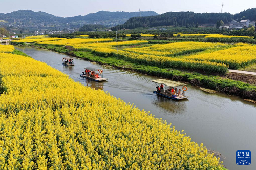 3月5日,游客在四川省南充市蓬安縣正源鎮(zhèn)石牛村乘坐游船賞花游玩(無(wú)人機(jī)照片)。(新華社發(fā) 劉永紅 攝)