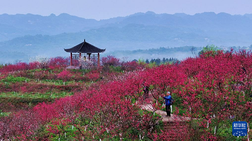 3月5日,游客在四川省瀘州市納溪區(qū)上馬鎮(zhèn)的桃林里賞花游玩(無(wú)人機(jī)照片)。(新華社發(fā) 廖勝春 攝)