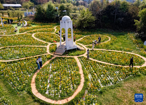 3月10日,游客在昆明名花谷游玩(無人機照片)。(新華社記者 陳欣波 攝)