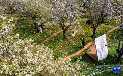 3月10日,游客在昆明名花谷拍照打卡(無人機照片)。(新華社記者 陳欣波 攝)