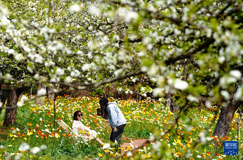 3月10日,兩名游客在昆明名花谷拍照休閑。(新華社記者 陳欣波 攝)
