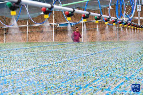 3月18日,山西省運(yùn)城市夏縣廟前鎮(zhèn)楊村的村民使用噴灌設(shè)備為西瓜苗澆水。(新華社記者 曹陽(yáng) 攝)