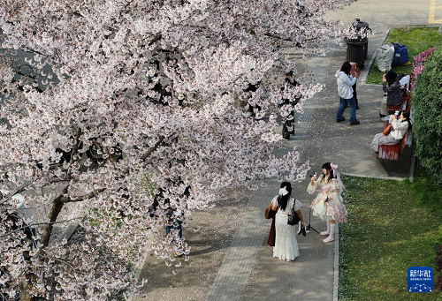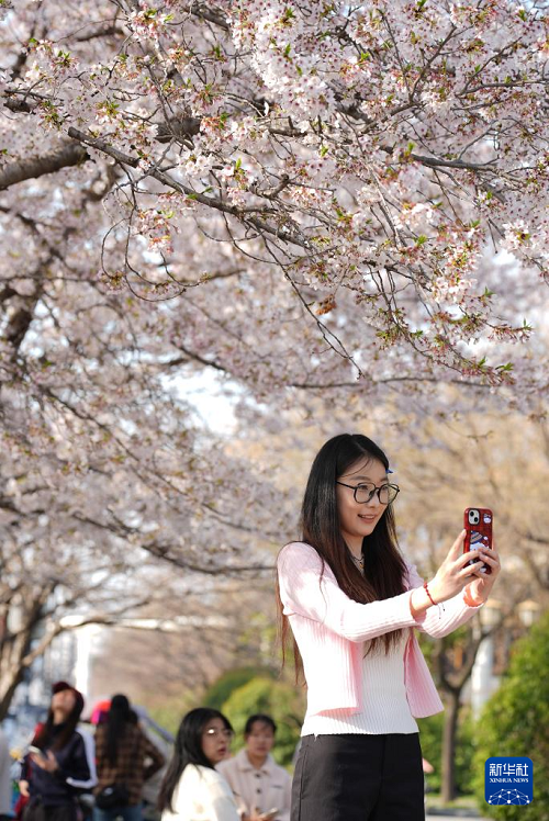 3月24日,游人在西安市雁塔區(qū)曲江池西路的櫻花樹下拍照。(新華社記者 邵瑞 攝)