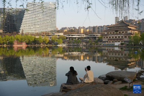 3月24日,游人在西安曲江池遺址公園賞景、拍照。(新華社記者 邵瑞 攝)