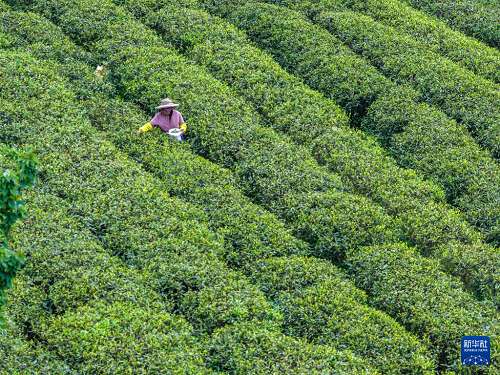 4月9日,茶農(nóng)在青龍鄉(xiāng)茶葉基地內(nèi)采摘春茶。(新華社記者 唐奕 攝)