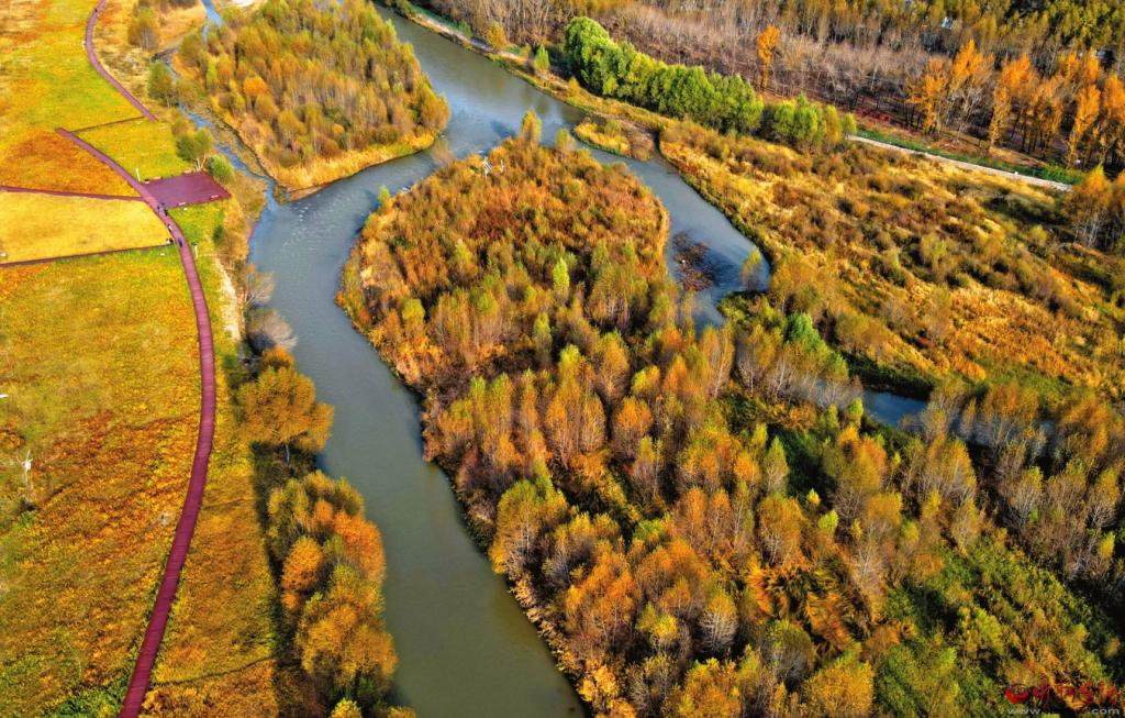 圖為濕地公園內,汾河河道蜿蜒曲折,水面清澈明凈,景致秀麗。