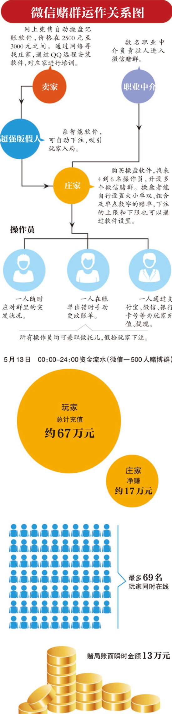 新華網(wǎng)記者 盧俊宇 6月12日,某報記者臥底微信賭場的報道給人們揭開了“微信賭場”的可怕內(nèi)幕:開一局只需5分鐘,下注、開局、下注……賭局像車輪滾動,你甚至來不及眨幾下眼,也不知道錢輸給了誰,成千上萬賭資就已蒸發(fā)。一位賭徒這樣描述,“血淋淋的,押下去是一串沒有感覺的數(shù)字,玩完才發(fā)現(xiàn)輸了一大筆,這比現(xiàn)實中的賭場恐怖太多?!?/p> 從去年開始,廣東、陜西、貴州、浙江等地公安部門相繼破獲一批利用微信賭博案件,賭資動輒上千萬元。這是一個危險信號,利用微信紅包賭博正在全國各地蔓延,已有愈演愈烈之勢。 與傳統(tǒng)賭博相比,微信賭博具有更大的危害性,警方打擊起來也面臨新的困難。傳統(tǒng)的賭博,有場地、有工具、有籌碼,只要抓準時機,一逮一個準。而微信紅包賭博,無需場地,無需工具(有手機即可),也不見籌碼,而且參與人數(shù)無上限。它更隱蔽、更隨機、更靈活,因此也更難被發(fā)現(xiàn)。就算參與者想“反水”,但囿于“殃及自己”的顧慮,也不敢隨便報案。 而且,微信賭博蔓延迅速、涉及面廣。玩法多樣,每個群都可以建立一套獨特的游戲規(guī)則,傳播速度呈裂變式擴散。借著“紅包接龍”的瓶子,注入“下注博彩”“抽頭賺錢”的酒,表面是“輸贏皆可能”,但博彩者往往悲哀地發(fā)現(xiàn),最終贏得盆滿缽滿的總是群主、包主、財務等組織者,輸個一絲不掛的總是自己。當圖好玩的“拼手氣”變成殺紅眼的“賭輸贏”,微信紅包原有的娛樂性蕩然無存,而變成充滿兇險的賭場。 因此,面對微信賭場,不能放任自流。各地公安機關(guān)對此要高度重視,必須采取“零容忍”的態(tài)度重拳打擊,制訂并實施有效的針對網(wǎng)絡(luò)賭博打擊之策。否則,必然會導致更多不法分子的效仿。 目前雖沒有專門針對微信賭博的法律法規(guī),但2010年《最高人民法院、最高人民檢察院、公安部關(guān)于辦理網(wǎng)絡(luò)賭博犯罪案件適用法律若干問題的意見》中已將利用互聯(lián)網(wǎng)、移動通訊終端等傳輸賭博數(shù)據(jù),組織賭博活動認定為“開設(shè)賭場”行為。所以微信賭博適用《刑法》關(guān)于賭博罪和開設(shè)賭場罪的規(guī)定及相關(guān)司法解釋。 但,這遠遠不夠。對于微信搶紅包和賭博之間關(guān)系的準確定義,讓相關(guān)的執(zhí)法寸步難行。因此,應盡快出臺針對利用微博、微信等社交工具賭博的法律法規(guī),避免更多人因賭博而遭受財產(chǎn)損失,也才能讓執(zhí)法部門有法可依。 另外,每一個互聯(lián)網(wǎng)公司都應該責無旁貸地配合相關(guān)部門進行監(jiān)控。將監(jiān)管前移,是每一個互聯(lián)網(wǎng)公司和相關(guān)部門應該共同構(gòu)建的“防火墻”。只有內(nèi)外合力,“微信紅包賭博”的生存空間才會越來越小。 最后,也提醒那些深陷紅包賭局中無法自拔的賭客,早日從心理層面褪掉賭癮,賭海無邊,回頭是岸。否則傾家蕩產(chǎn)、妻離子散的人生悲劇就離你不遠了。 (責任編輯:盧相汀) |