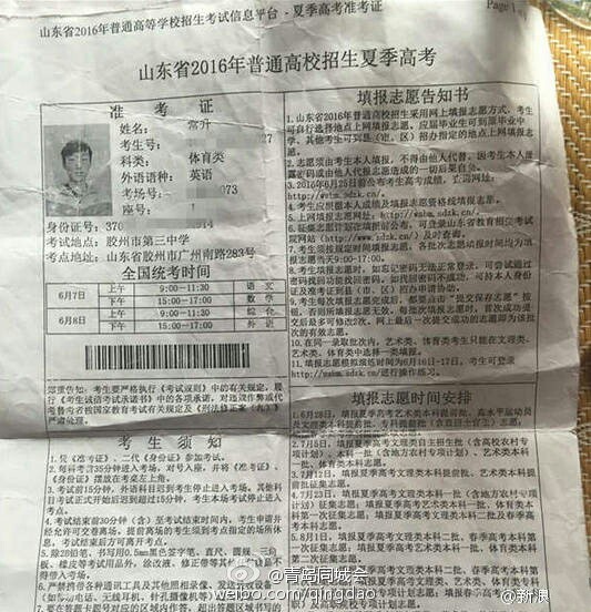 “如果不是他收到了通知書,我永遠也不會知道這個秘密?!背I嬖V記者,他口中的“他”是室友兼摯友郭某。常升和郭某都是體育特長生,兩人今年高考成績相仿,在填報志愿的當天,先后用體育老師遲老師的電腦填報了志愿,均為陜西師范大學(xué)的免費師范生。但是錄取通知一下,常升傻了眼,自己并沒有被錄取,但是比自己分數(shù)更低的郭某卻收到了錄取通知書,而且陜西師范大學(xué)在山東招收的免費師范生還沒有招滿,種種情況讓常升十分不理解。圖為常升高考相關(guān)信息。