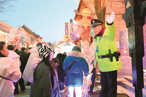 與熱鬧喜慶人群相伴而行的是執(zhí)勤民警貼心服務的身影。