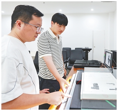 實驗室內(nèi),張展(左)正在和學生掃描錄入甲骨文拓本?;魜喥綌z