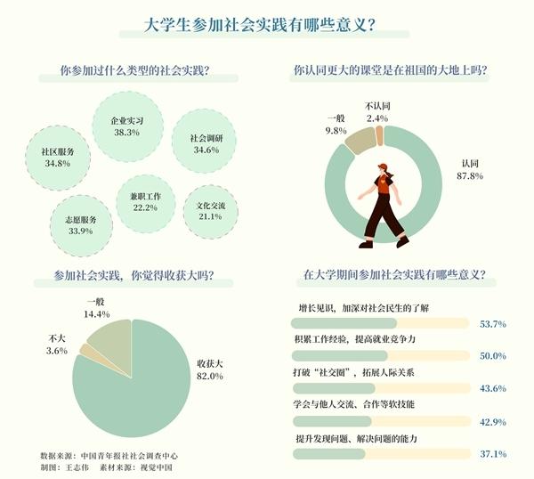 調(diào)查顯示,87.8%的受訪大學(xué)生認(rèn)同,更大的課堂在祖國的大地上。對(duì)于參加社會(huì)實(shí)踐的意義,受訪大學(xué)生把增長見識(shí),加深對(duì)社會(huì)民生的了解排在首位,獲選率為53.7%,積累工作經(jīng)驗(yàn),提高就業(yè)競爭力(50.0%),打破“社交圈”,拓展人際關(guān)系(43.6%)分別排在第二、三位。