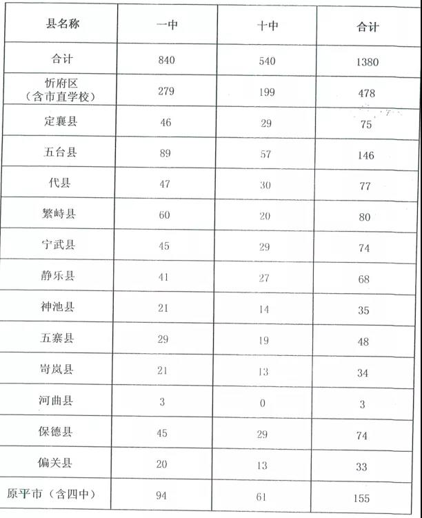 2.忻州市2020年忻州一中、十中招生指標分縣計劃