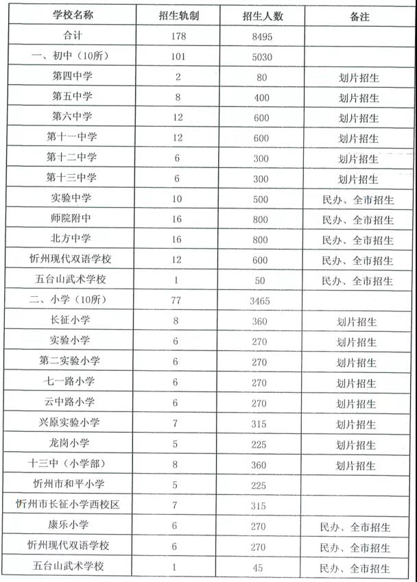 4.忻州市2020年市直義務教育階段學校招生計劃