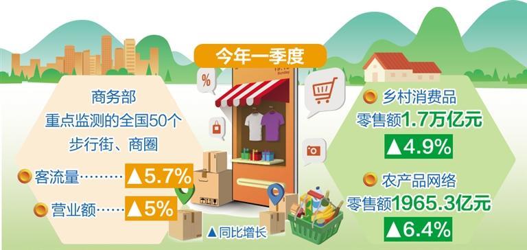 城市商業(yè)增速穩(wěn)定,一季度商務(wù)部重點(diǎn)監(jiān)測的全國50個(gè)步行街、商圈客流量、營業(yè)額同比分別增長5.7%、5%。縣域消費(fèi)市場持續(xù)升溫,鄉(xiāng)村消費(fèi)品零售額1.7萬億元,同比增長4.9%,增速高于城鎮(zhèn)0.4個(gè)百分點(diǎn)。農(nóng)村電商蓬勃發(fā)展,全國農(nóng)村網(wǎng)絡(luò)零售額6697.5億元,同比增長5.1%;農(nóng)產(chǎn)品網(wǎng)絡(luò)零售額1965.3億元,同比增長6.4%。