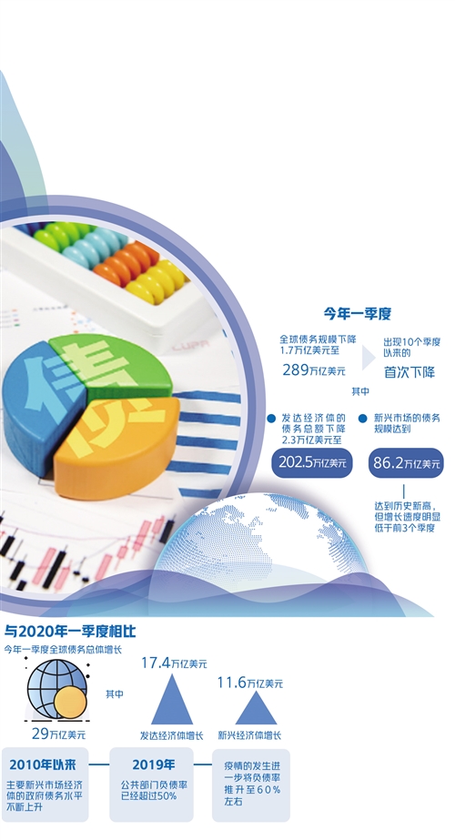 日前,國(guó)際金融協(xié)會(huì)發(fā)布了最新的全球債務(wù)監(jiān)測(cè)報(bào)告。好消息是全球債務(wù)規(guī)模在2021年一季度出現(xiàn)10個(gè)季度以來的首次下降;壞消息是全球債務(wù)規(guī)模體量巨大、償債能力不均衡等問題依然存在。