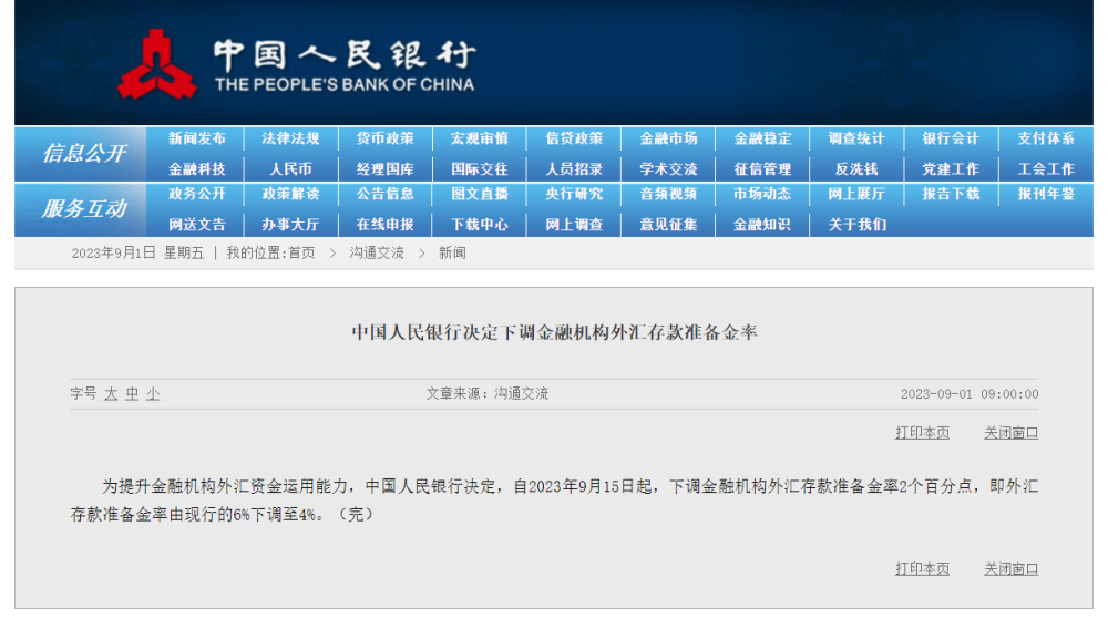 為提升金融機構(gòu)外匯資金運用能力,中國人民銀行決定,自2023年9月15日起,下調(diào)金融機構(gòu)外匯存款準備金率2個百分點,即外匯存款準備金率由現(xiàn)行的6%下調(diào)至4%。
