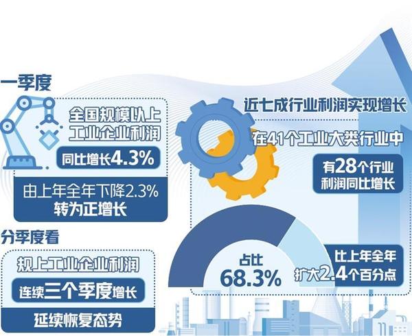 市場需求逐步改善,新動能加快成長,帶動企業(yè)營收繼續(xù)恢復(fù)。一季度,規(guī)上工業(yè)企業(yè)營業(yè)收入同比增長2.3%,增速比上年全年加快1.2個百分點(diǎn)。國家統(tǒng)計局工業(yè)司統(tǒng)計師于衛(wèi)寧表示,當(dāng)季營收連續(xù)3個季度增長,為企業(yè)盈利持續(xù)恢復(fù)創(chuàng)造有利條件。