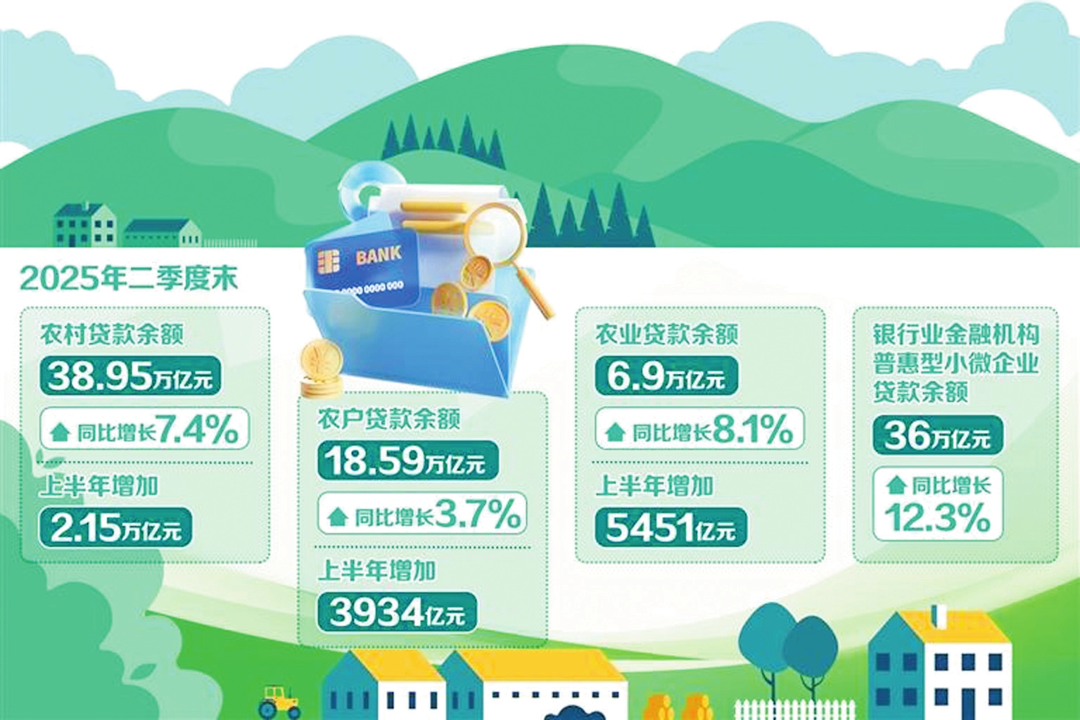 總的來看,今年二季度涉農(nóng)金融投放增量擴面。2025年二季度金融機構(gòu)貸款投向統(tǒng)計報告顯示,2025年二季度末,農(nóng)村貸款余額38.95萬億元,同比增長7.4%,上半年增加2.15萬億元。農(nóng)戶貸款余額18.59萬億元,同比增長3.7%,上半年增加3934億元。農(nóng)業(yè)貸款余額6.9萬億元,同比增長8.1%,上半年增加5451億元。